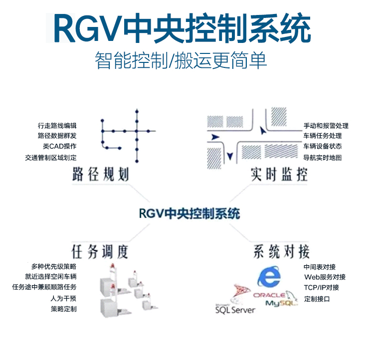 RGV屬于是有軌制導車輛,運行路線上有導軌的引導,全程有自動化電器控制,可以滿足高精度的對接。由于有軌道的限制,RGV沒有自動導引搬運車AGV的靈活性好,智能程度高。